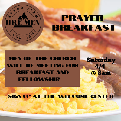 Men’s Prayer Breakfast April 4, 2026 8:00 AM – 9:00 AM Uwharrie Community Church- Annex 1510 Moss Springs Rd Albemarle NC 28001 Get Directions Our Men’s Group puts on a breakfast for the men of the Church. Please come eat and join in the fellowship. Sign-ups for this event can be found at the Welcome Center.
