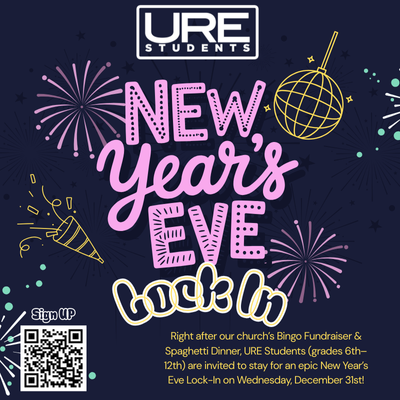 Right after our church’s Bingo Fundraiser & Spaghetti Dinner, URE Students (grades 6th–12th) are invited to stay for an epic New Year’s Eve Lock-In on Wednesday, December 31st!