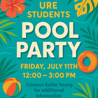 URE Students Pool Party July 11, 2025 12:00 PM – 3:00 PM URE Students Pool Party! URE Students, you’re invited! Come beat the heat with us at our summer POOL PARTY Friday, July 11th 12:00 – 3:00 PM Bring your towel, sunscreen, and good vibes! Location: Location will be shared upon RSVP to Kallie Questions? Contact Kallie Young